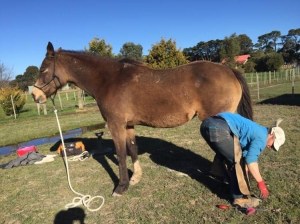 Pearl and I have not enjoyed a great relationship, and of late her displeasure, and unwillingness to co-operate with haltering and basic handling has increased. She has always been a ‘touch me not’ horse and treating injuries was ‘at my own risk’. I could get co-operation with the usual natural horsemanship kind of training methods, but the willingness, understanding or trust was not there. Monika introduced us to the Trust Technique, and Pearl and I are now learning to listen to, respect and read each other with much greater understanding and a lot less defensiveness. We both trust each other a whole lot more. Haltering now happens without biting, running off, stomping etc. Last week Pearl suffered a nasty injury on her lower back leg requiring veterinary attention and sedation to be able to attend to the injury and it was bandaged from hock to fetlock. Two days later the trimmer was due and I suggested we wouldn’t bother trying to do her trim. The trimmer has been using TT with her horses and we decided to try and trim the injured leg using TT. I had no expectation, was probably a teensy bit skeptical, but Pearl got trimmed! Not once did she show any concern or distrust or move away. She was also calmer and more co-operative with the other feet being trimmed. Each day I am using TT to handle the injured leg in preparation for the next bandage change, and Pearl is non reactive. I am humbled by this horse, after years of me not listening to her and not understanding or regarding her she is giving me so much trust. Thank you Monika and TT.